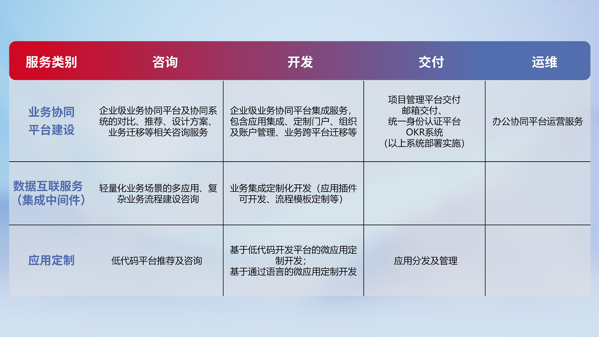 针对钉钉、、、、企微、、、、IDaas等平台级产品提供产品的规划、、方案、、交付、、、、定制化开发等服务,,,,实现如统一协同办公、、智能客户服务、、混合会议管理、、智能数据查询、、等业务场景,,,,实现数字化转型。。